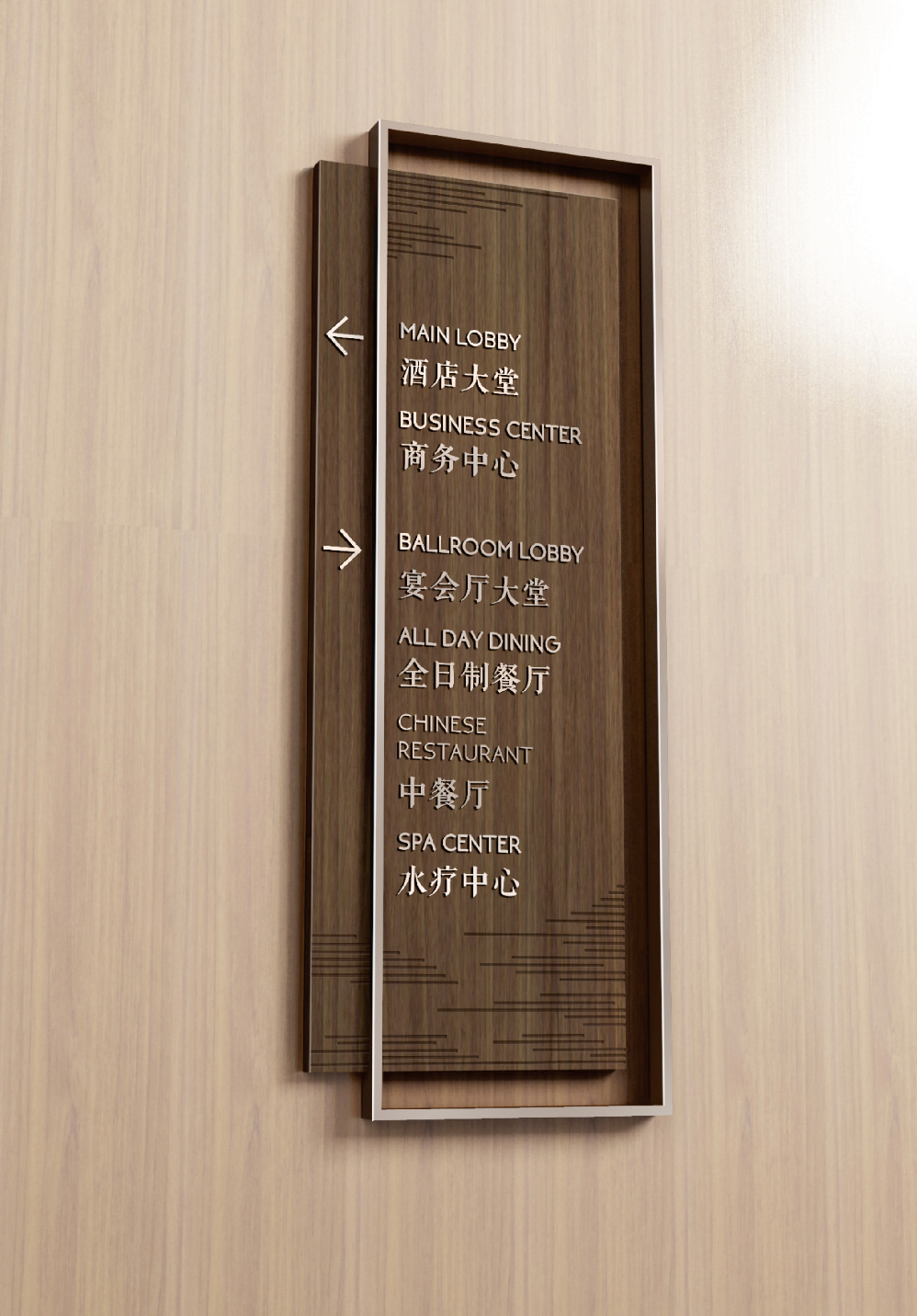 艾米担纲北京乐多港万豪酒店导视系统设计方,从酒店所处的自然环境中汲取灵感,以“山色、禅意、几何、自然”为立意,结合酒店空间风格,融合中式风尚与现代简约之美,呈现契合酒店定位的创意导视系统。