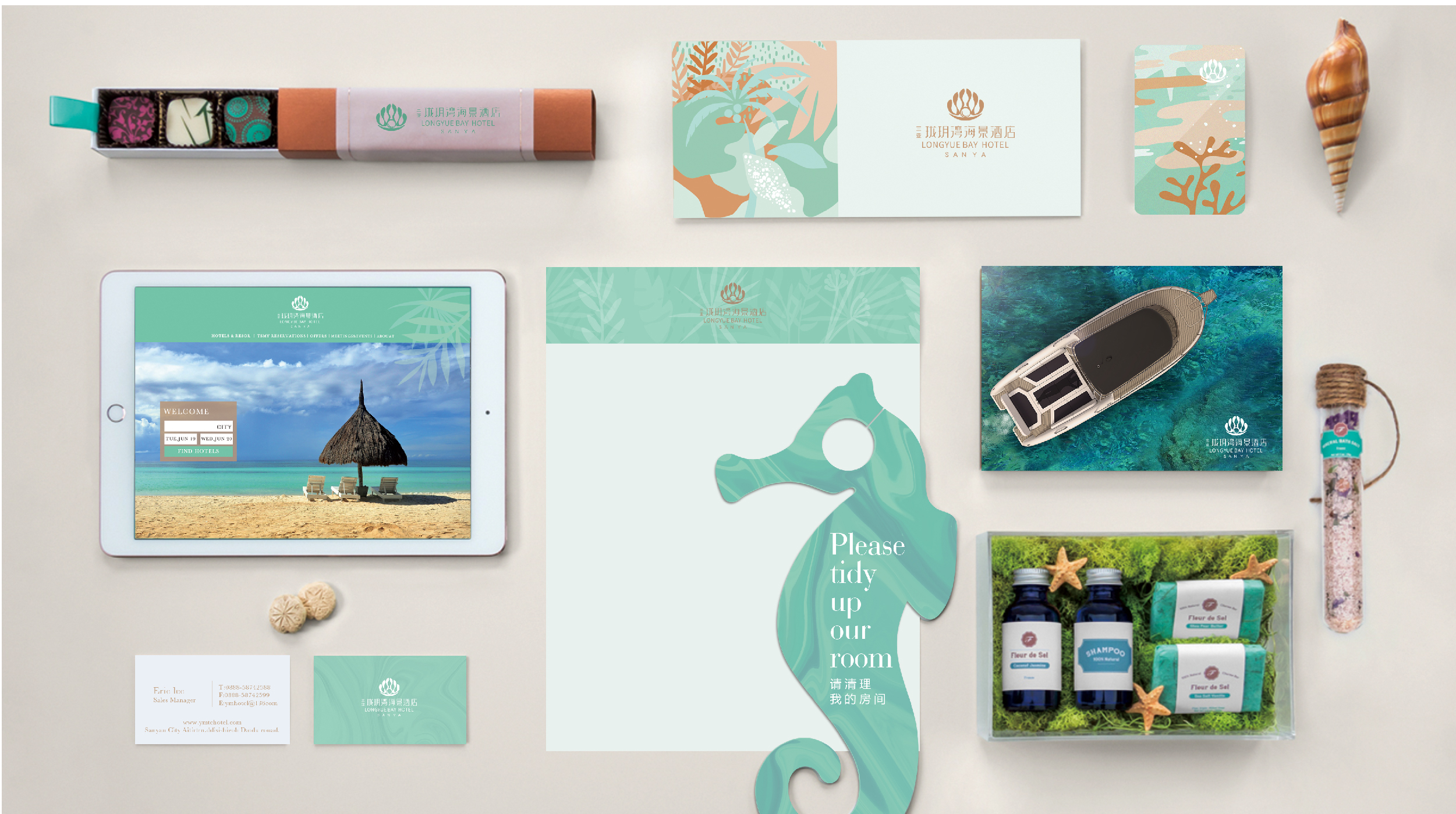 本案品牌设计从开阔的海景与独特的地理风情中汲取灵感,以“贝壳含珠”设计理念,弧形柔美线条,传递珑玥湾海景酒店的妙曼美景,宛如遗落在三亚湾上一颗璀璨的明珠,静谧而遗世独立。